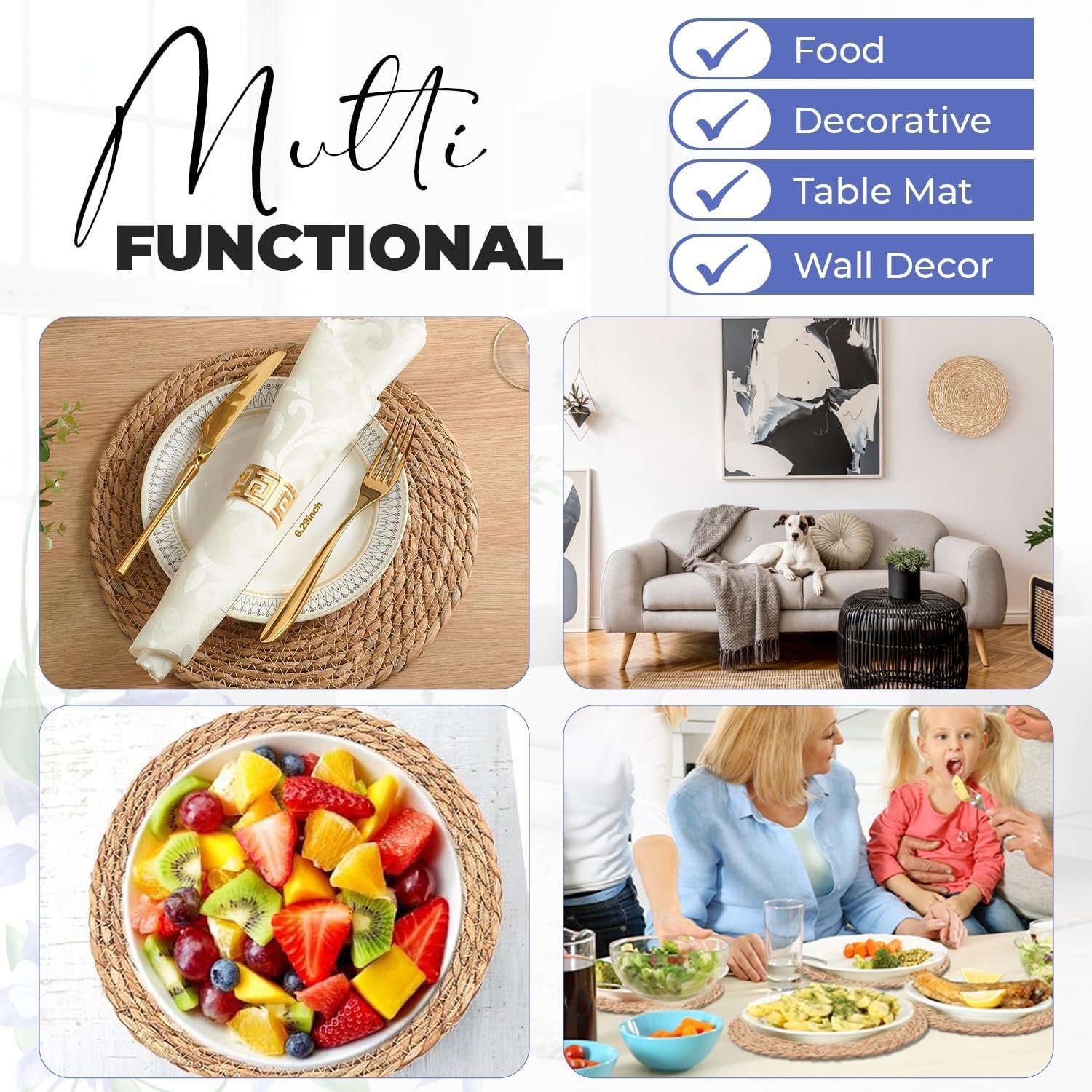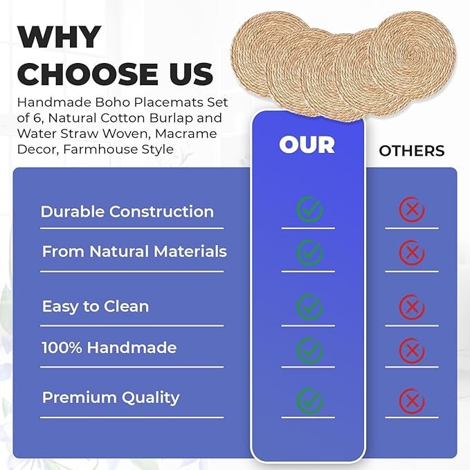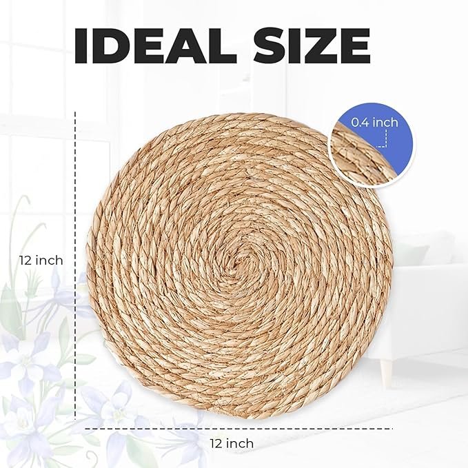 • ๐„๐ฅ๐ž๐ ๐š๐ง๐ญ ๐๐จ๐ก๐จ ๐ƒ๐ž๐ฌ๐ข๐ ๐ง:The natural water hyacinth material and rustic golden hue bring warmth and elegance to any dining table. The woven pattern adds a sophisticated touch, making them perfect for dining, kitchen, or even as home dรฉcor accents in your living room or entryway.