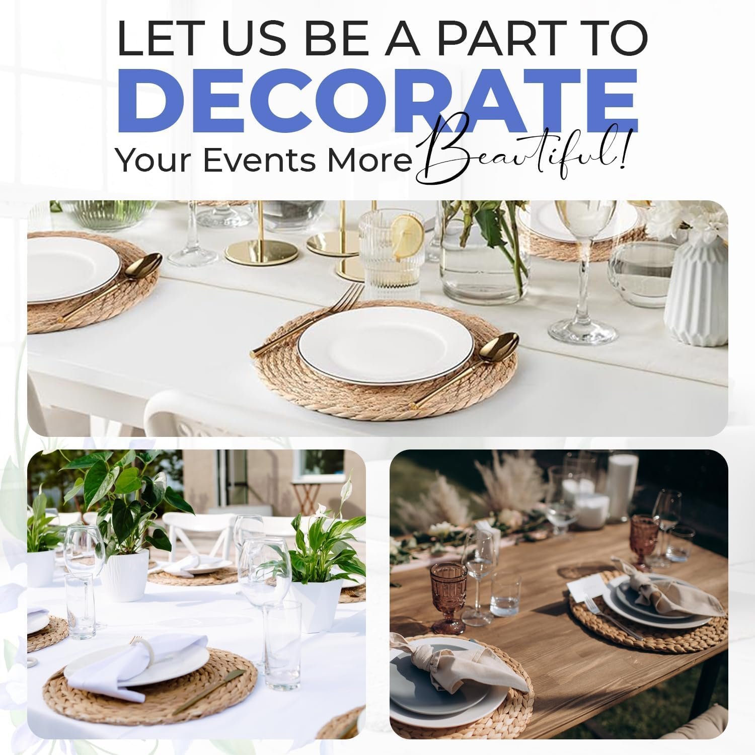 • ๐•๐ž๐ซ๐ฌ๐š๐ญ๐ข๐ฅ๐ž ๐Ÿ๐จ๐ซ ๐€๐ฅ๐ฅ ๐’๐ž๐ญ๐ญ๐ข๐ง๐ ๐ฌ: Ideal for both indoor and outdoor use, these woven chargers can be used in your kitchen, dining area, or even as decorative pieces for your wedding or farmhouse-themed events. Their round shape and rustic design make them a versatile and unique addition to any home dรฉcor